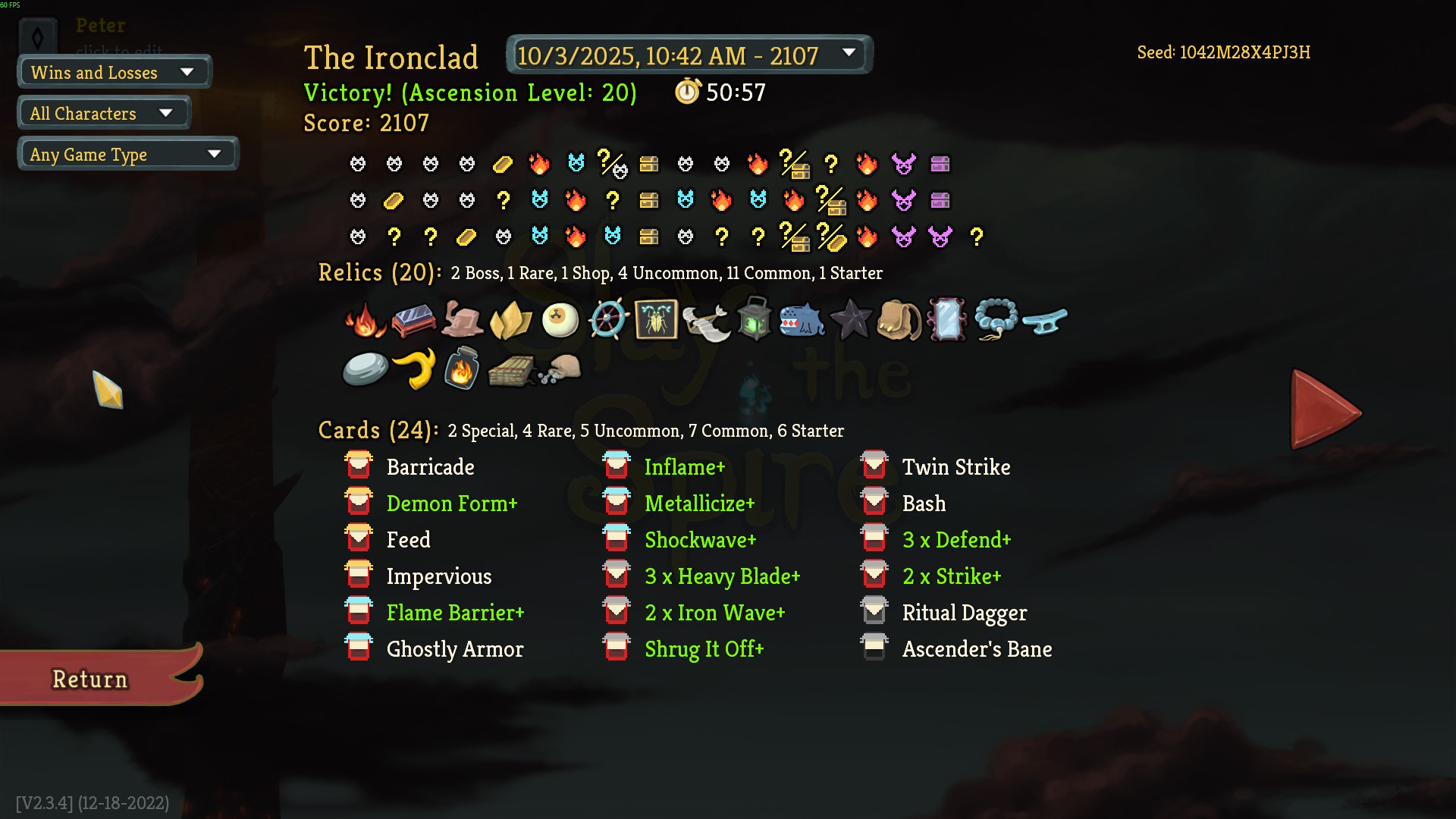 Im vierten Versuch seit der Reinstallation hat es dann endlich geklappt und das sogar mit vollständigen HP nach dem Endboss 8) Gewinnbringend war definitiv Snecko Eye in Kombination mit vielen teuren Karten, darunter die bewährte Kombi aus Demon Form & Heavy Blade.